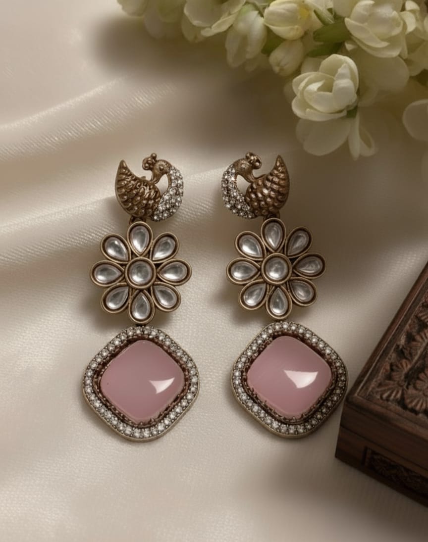 Add elegance to your look with these Blush Swan Floral Kundan Earrings, featuring a swan motif, floral kundan design, and a soft blush pink stone drop. Perfect for weddings and festive occasions, they blend traditional charm with modern style.