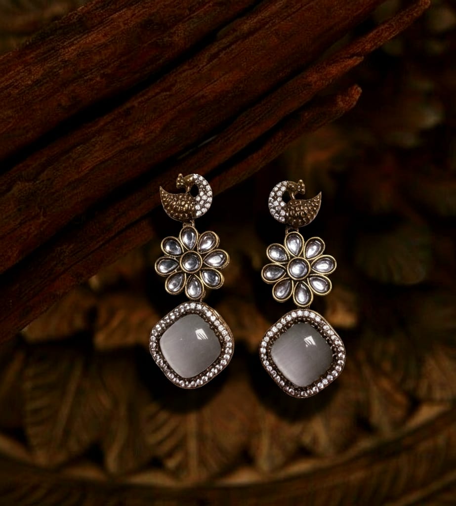 The Moonlit Floral Drop Earrings blend a crescent moon stud with a delicate floral motif, finished with a luminous square-cut drop stone. Subtle sparkle and neutral tones make them easy to style with both traditional and modern looks. Elegant yet eye-catching, they’re perfect for special occasions or evening wear.