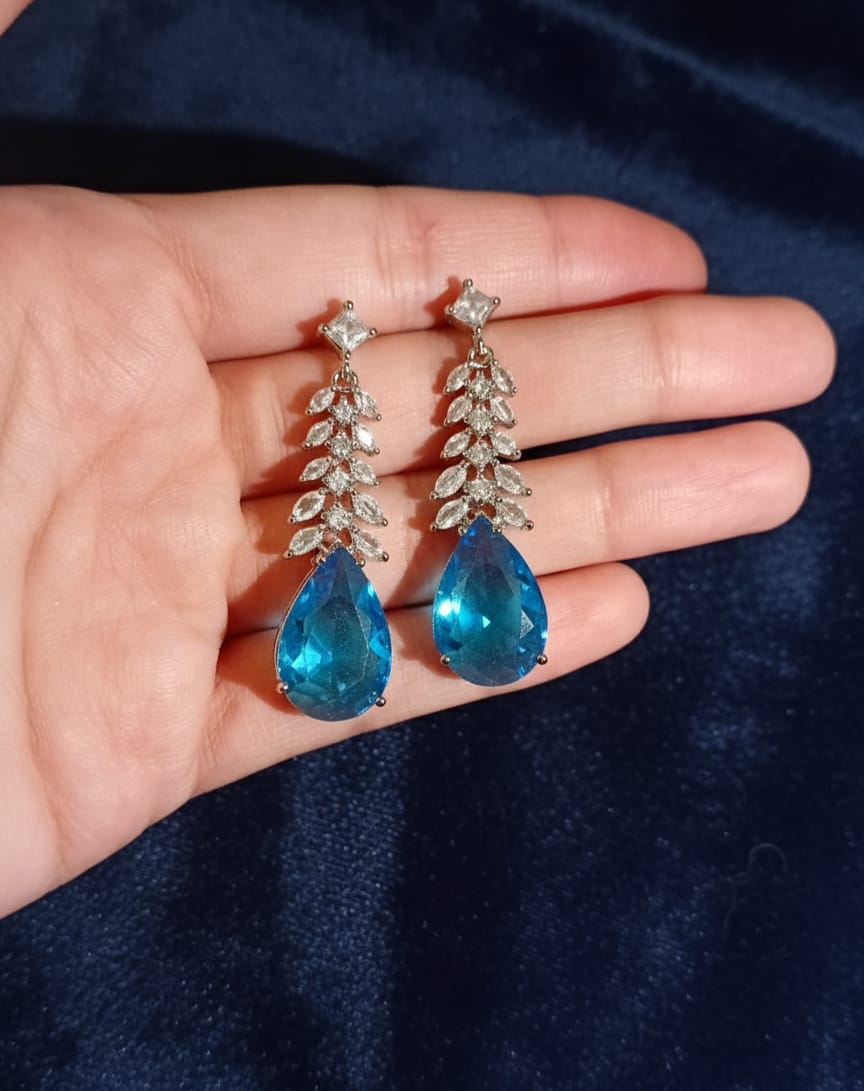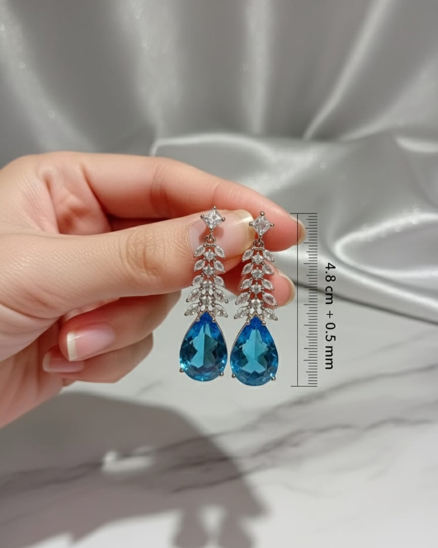 Make a statement with these Ocean Teardrop Crystal Dangle Earrings, featuring a radiant pear-shaped blue crystal that reflects the beauty of the sea. A delicate cascade of marquise-cut stones above adds a leaf-inspired sparkle for extra elegance.