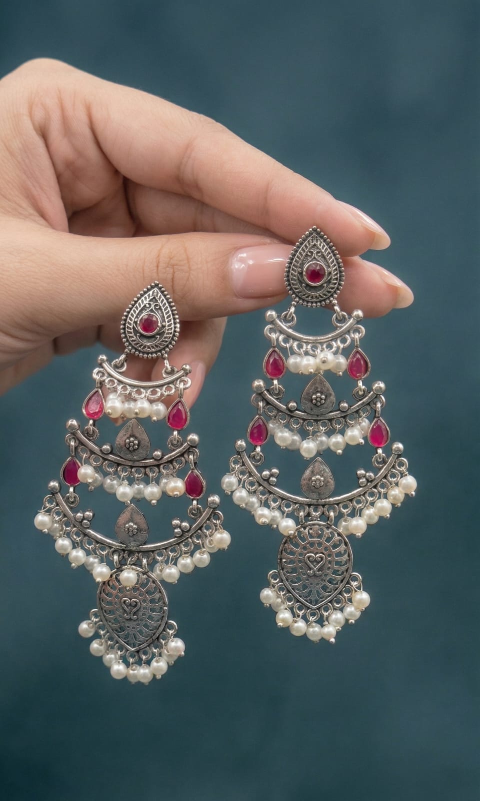 Make a statement with these handcrafted oxidized silver chandbali earrings, featuring layered crescent detailing with ruby-toned stones and delicate pearl drops. The intricate design blends traditional charm with a modern touch, making them perfect for weddings, festive occasions, and ethnic outfits. Lightweight yet eye-catching, they offer elegance without compromising on comfort.