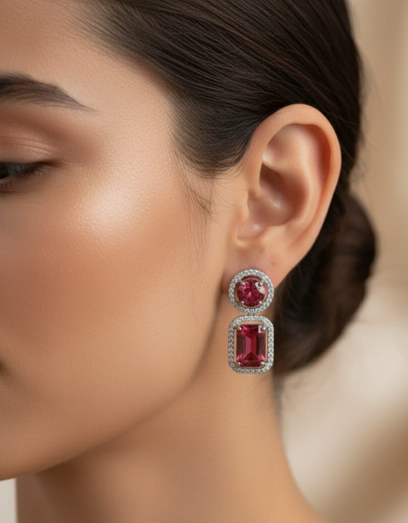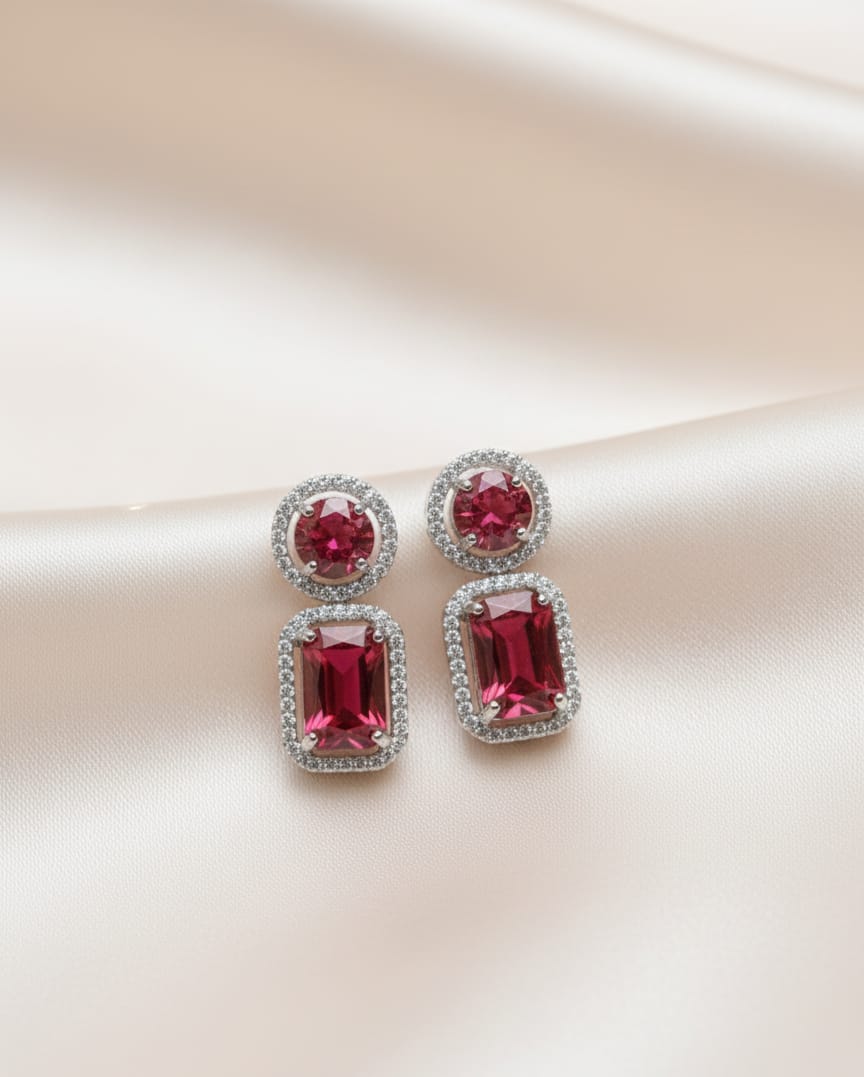 Elevate your style with these Ruby Glow Double Drop Earrings, featuring a round ruby-toned stone paired with a striking rectangular drop. Both are framed with shimmering crystals for added brilliance.